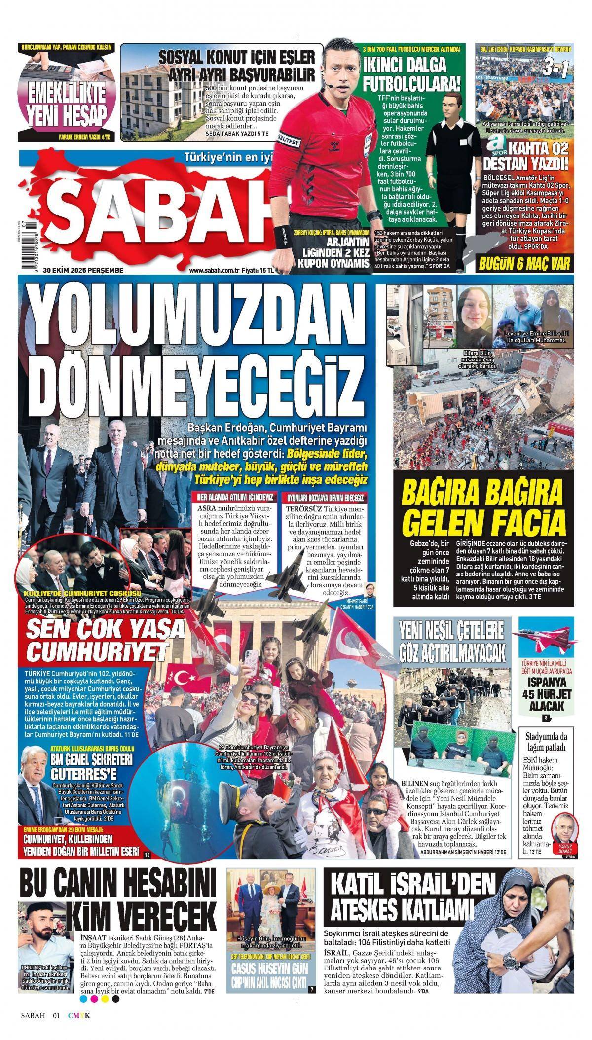 Sabah Gazetesi 30 Ekim 2025 Günü Manşeti