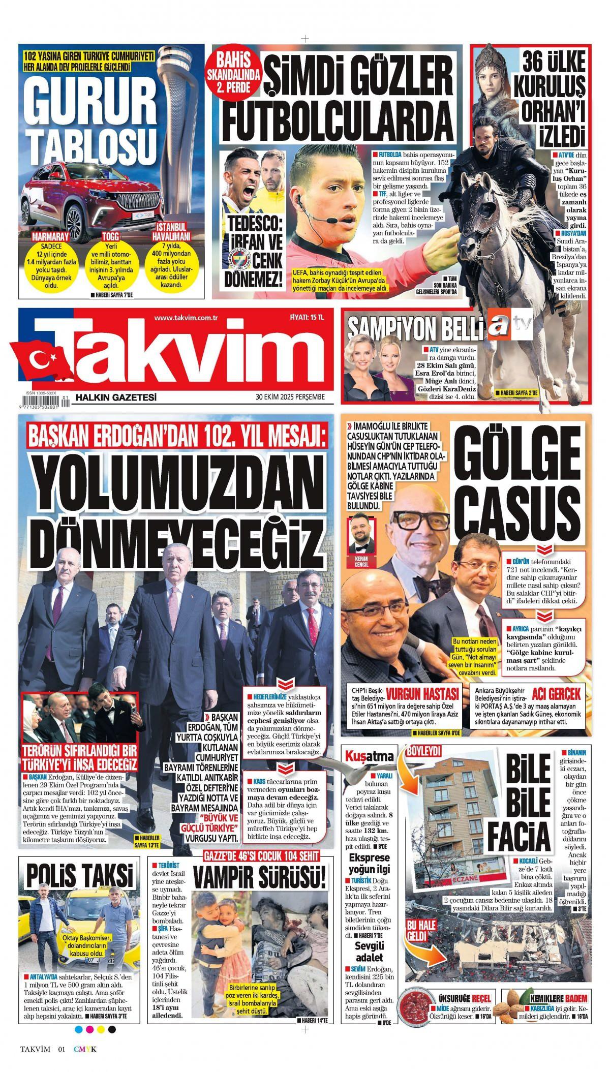 Takvim Gazetesi 30 Ekim 2025 Günü Manşeti